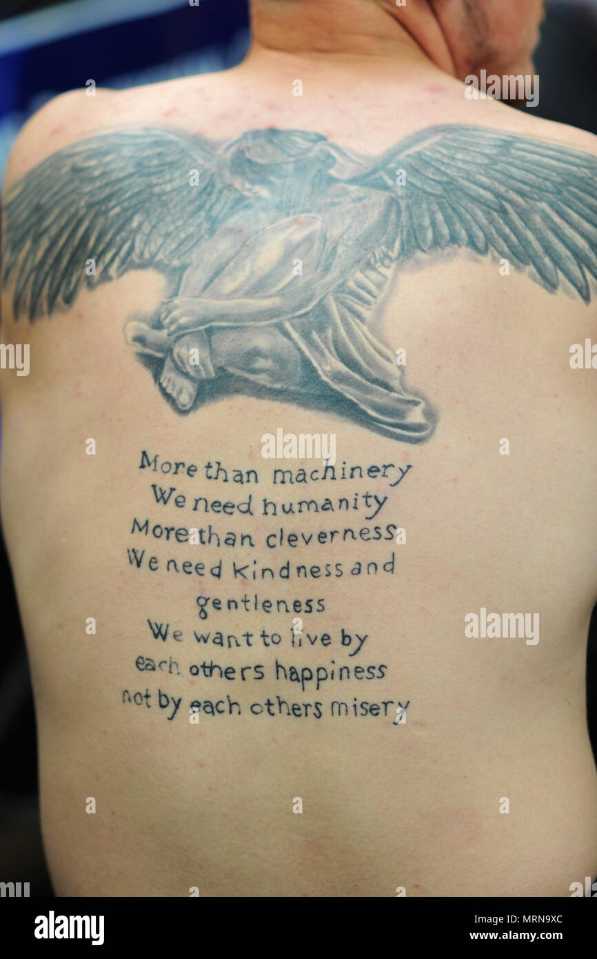 London Grossbritannien 26 Mai 2018 Ein Mann Mit Einem Zuruck Tattoo An Der 5 Grossen Britischen Tattoo Show Die Am Wochenende Im Alexandra Palace London Grossbritannien Die Show Bietet Uber 300 Der